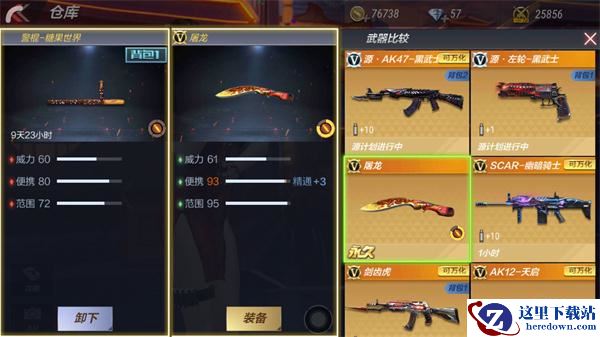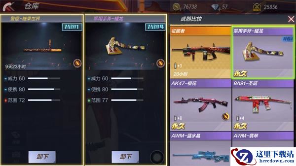 如图,警棍-糖果世界和低一品质的军用手斧-耀龙相比,前者威力、便携和后者等同,范围略逊于后者,但因前者配有多项额外技能,因而两者半斤八两。