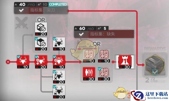 指标集缺失中,选择的是只携带7个干员以及最终防线。尖刀则选择三个奇美拉强化解锁缺失即可。