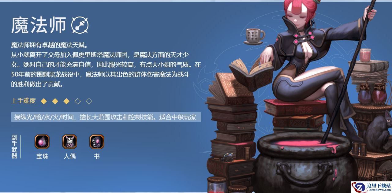 从小就离开了父母加入佩奥里斯塔魔法师团,是魔法方面的天才少女。她对自己的才能充满自信,因此眼光较高,有点大小姐的气质。在50年前的围剿黑龙战役中,魔法师以其出色的群体伤害魔法为战斗的胜利做出了贡献。