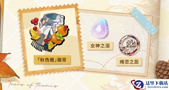 完成活动任务可获得活动限定徽章【秋色暖】、【女神之泪】、【绻恋之蕊】及思绪养成素材奖励。