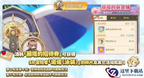 3、我们通关了活动关卡,会有几率掉落「丽塔的招待券」和「海底的珍珠」活动代币,我们通过消耗「丽塔的招待券」在丽塔的杂货铺进行抽奖,可以获取到诺诺泳装的角色碎片和大量的素材奖励;