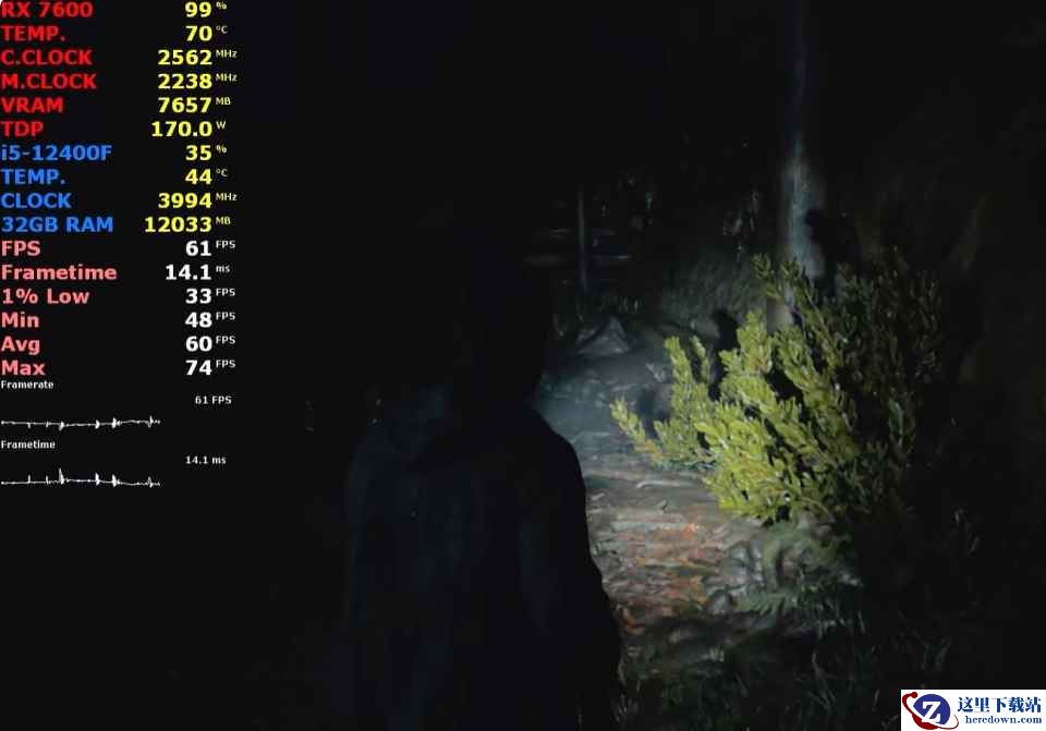 平均帧速为60 FPS,最低瞬时帧速为33 FPS,帧时间为14.1ms,CPU使用率为35%,温度为44℃,内存使用量为12.0GB,GPU使用率为99%,显存使用量为7.7GB,功耗为170W,温度为70℃。