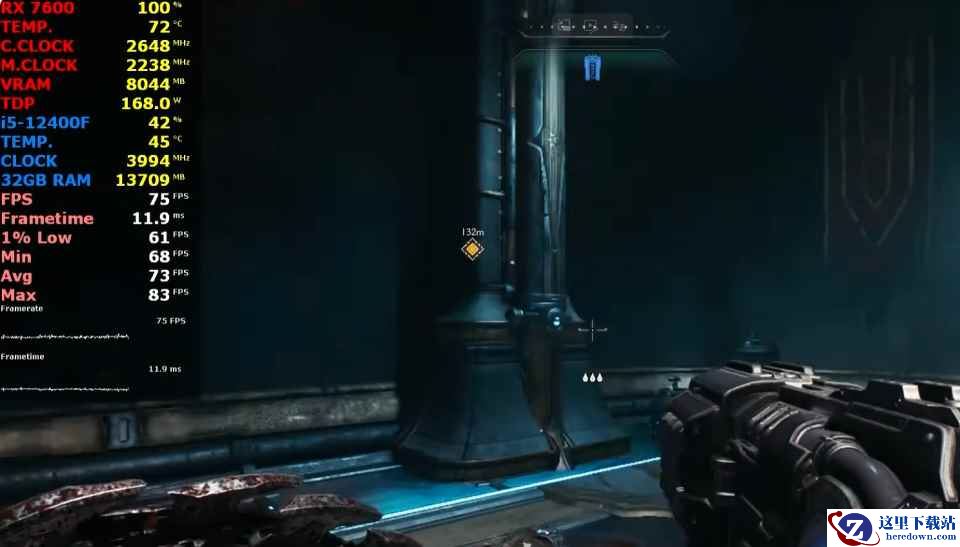 平均帧速为73 FPS,最低瞬时帧速为61 FPS,帧时间为11.9ms,CPU使用率为42%,温度为45℃,内存使用量为13.7GB,GPU使用率为100%,显存使用量为8.0GB,功耗为168W,温度为72℃。
