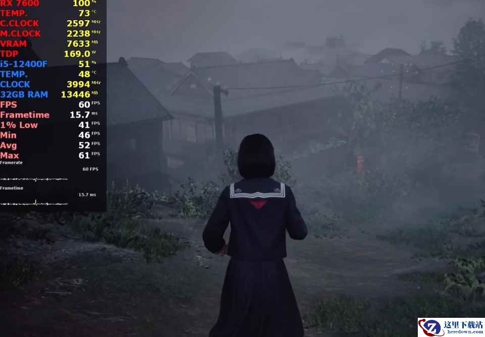 平均帧速为52 FPS,最低瞬时帧速为41 FPS,帧时间为15.7ms,CPU使用率为51%,温度为48℃,内存使用量为13.4GB,GPU使用率为100%,显存使用量为7.6GB,功耗为169W,温度为73℃。
