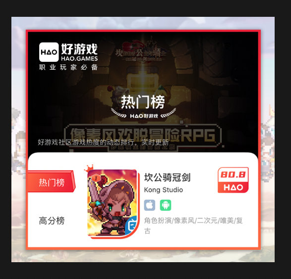 《坎公骑冠剑》是由美国公司Kong Studio研发,原名《Guardian Tales》,即《守望传说》。国内由B站代理后翻译为《坎特伯雷公主与骑士唤醒冠军之剑的奇幻冒险》,这么长的名字实际上也是一波炒作,但就由路人的反响来看,这波炒作非常成功。在游戏还未上线之际,就已经突破了百万关注,而上线首日,更在好游戏APP中登上热门榜第一,当日的评分也达到了80.3分。