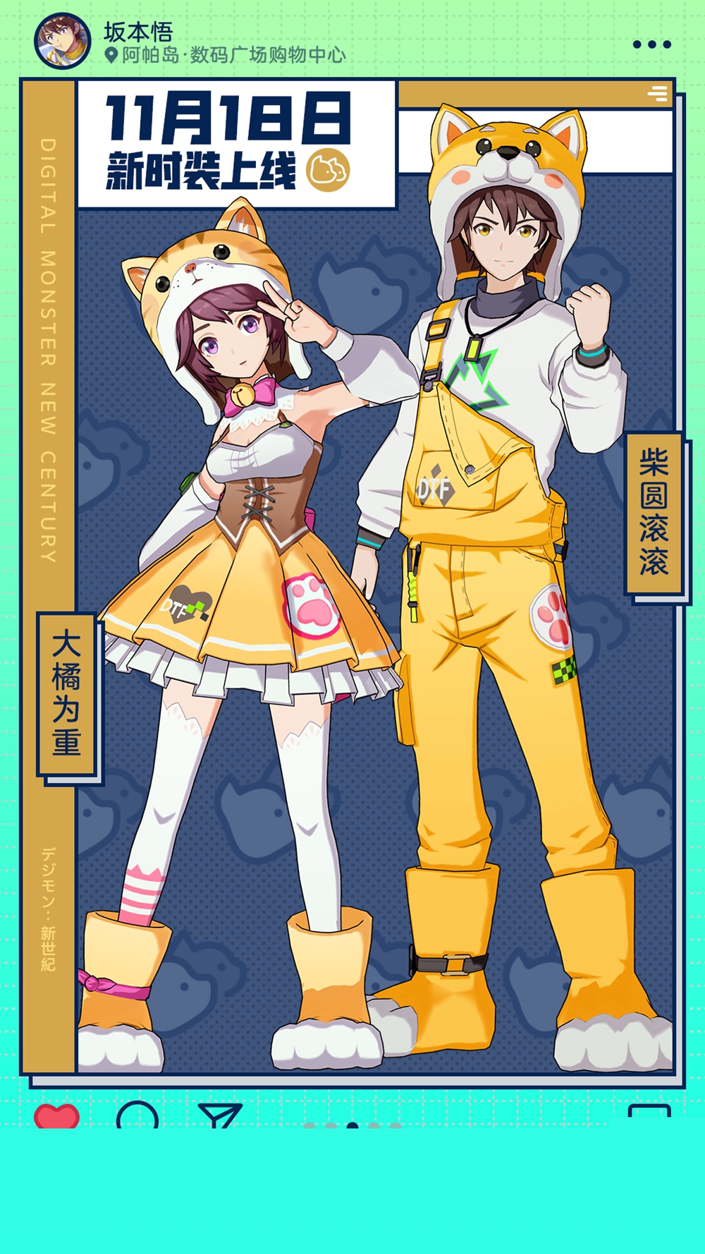 阿帕岛·数码广场购物中心上新啦!极具特色的全新时装萌动来袭,以萌犬外观为主题的男款时装【柴圆滚滚】,服饰图案皆蕴含犬系风格的造型设计;采用了软萌猫咪形象的女款时装【大橘为重】,服饰外观拥有DTF爱心图案,以及猫爪印记等可爱元素。