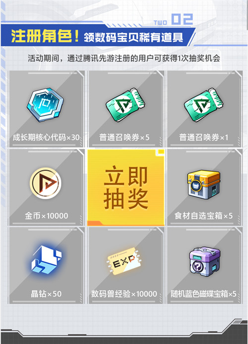 活动期间,通过腾讯先游注册的用户可获得1次抽奖机会,将有机会获得成长期核心代码、普通召唤券、食材自选宝箱、随机蓝色磁碟宝箱、晶钻、金币等珍贵礼品!