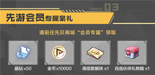凡是腾讯先游会员,将可在先贝商城领取“会员专属”奖励,奖励内容包括晶钻、金币、高级数据块、自选伙伴礼物箱等。