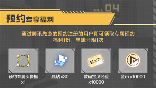 通过腾讯先游预注册的用户,即可领取专属预约福利1份,你将获得预约专属头像框、晶钻、数码宝贝经验、金币等好礼。