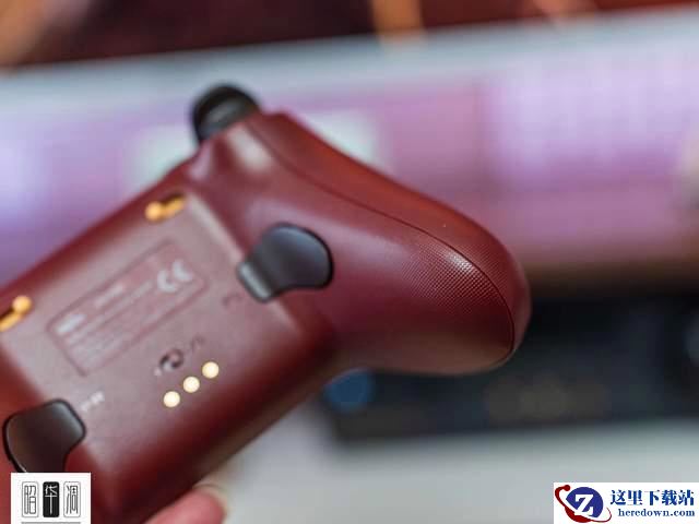 ▼对比之下,八位堂联名的握把位置是光面塑料,背面虽然同样有防滑颗粒,但实际上是在塑料材质上作出的颗粒工艺,几乎摸不出来。而且只要掌心稍微出点儿汗,握着就感觉黏糊糊的,完全不适合长时间作战。
