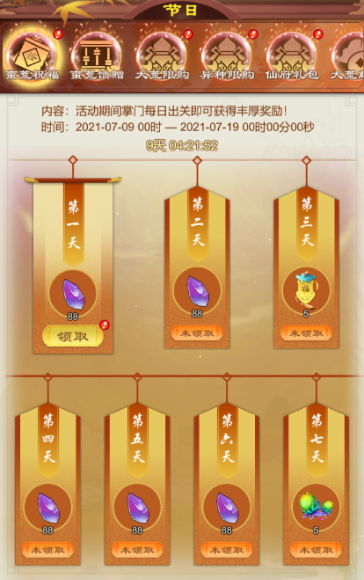 异世相连,福泽大地!活动期间(2021年7月9日-7月18日)内,玩家登陆游戏累计天数达到要求后,即可领取相应签到奖励。还有入世锦囊等多重超值礼包限时领取!投资蛮荒可获得将近11倍超值仙缘大奖!"大荒献礼"活动还有机会获得最新先天弟子及灵兽!