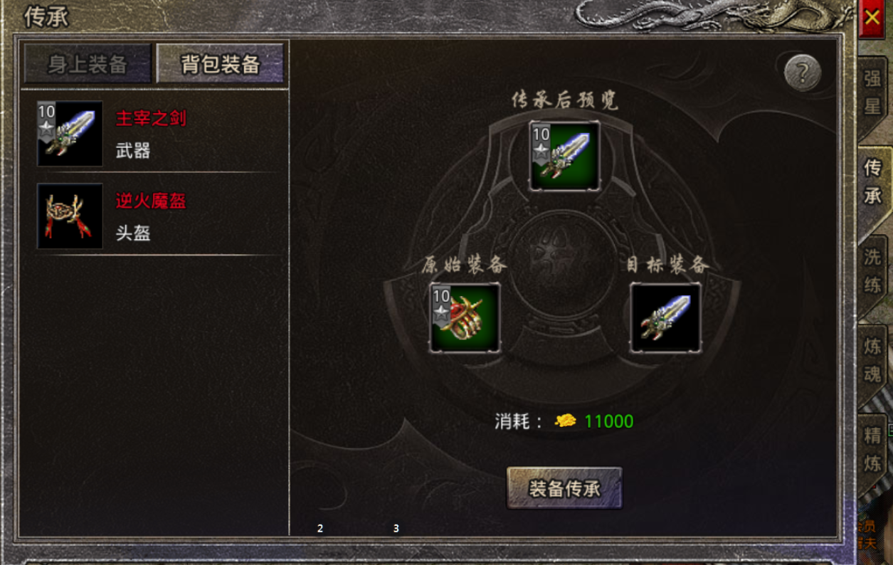 2、无论目标装备是否有强星、炼魂、精炼,传承装备的各种各种强化均会清空,所以传承需谨慎。