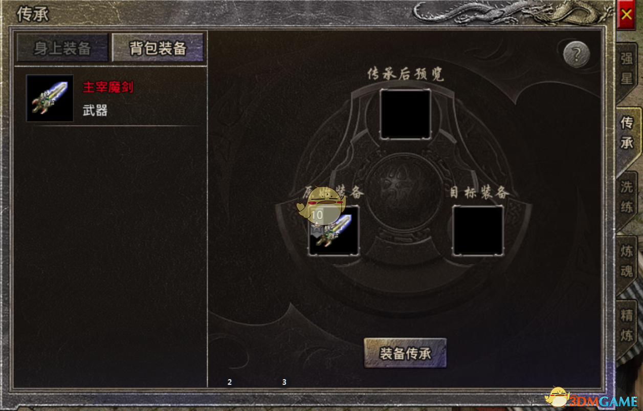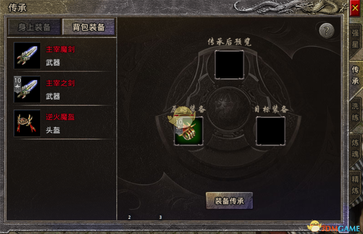 2、 装备传承仅限低品质装备向高等级装备或相同品质装备传承。