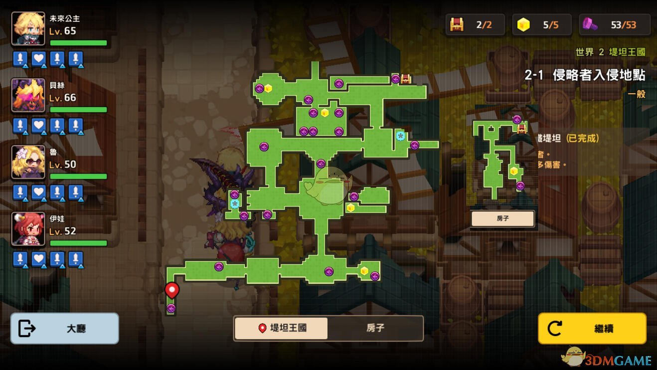 开局往下走有2个紫螺丝,房屋里有隐藏通道,地图左边有木桩的地方需要通关剧情3-6解锁钩爪才能过去,最后和公主对话可以得到1个黄钻。