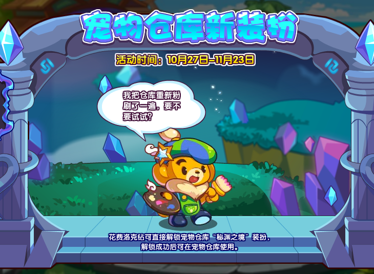 宠物仓库装扮来啦~到奇妙屋找到迷画小熊,花费洛克钻就可以解锁“秘渊之境”宠物仓库装扮啦!