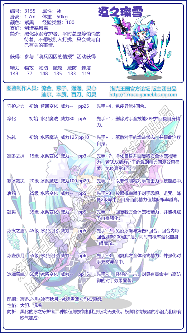 洛克王国沍之璨雪是编号3155的魔攻宠物,黑化的冰之守护者。种族值与技能相比原版均无变化。祝孵化情报蛋的小洛克们都有欧气加成。下面是小编给大家带来的《洛克王国》沍之璨雪技能表图鉴,技能表种族值可以让大家快速了解这个宠物各项信息,感兴趣的速来围观吧!
