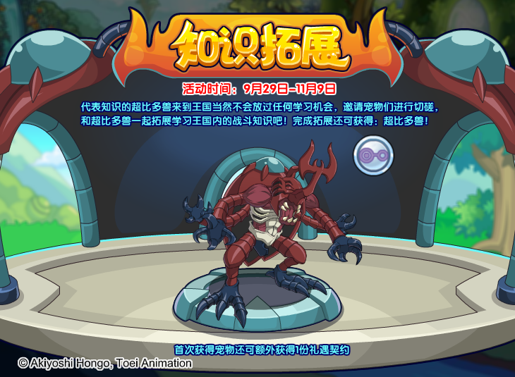 代表知识的超比多兽来到王国当然不会放过任何学习机会,邀请宠物们进行切磋,和超比多兽一起学习拓展王国内的战斗知识吧!完成拓展还可获得:超比多兽!(玩家拥有“数码核心”时,更容易邀请到未邀请过的宠物。)