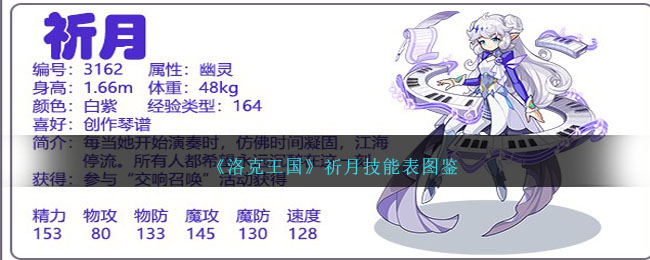 洛克王国祈月是编号3162的魔攻宠物,每当她开始演奏时,仿佛时间凝固,江海停流。所有人都希望永远沉醉在这一刻。下面是小编给大家带来的《洛克王国》祈月技能表图鉴,技能表种族值可以让大家快速了解这个宠物各项信息,感兴趣的速来围观吧!