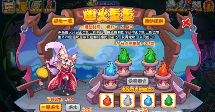 点亮幽火开启玄灵妲己的挑战,挑战胜利即可获得玄灵妲己的信物,集齐20个信物可以开启掌灯媚狐的进化,获得宠物:玄灵妲己!