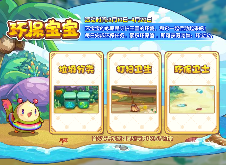 环宝宝的心愿是守护王国的环境,和它一起行动起来吧!每日完成环保任务,累积环保值,即可获得宠物:环宝宝。