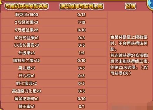 4、若连续获得24次奖励后仍末能获得蜂王蜜,则第25次必得,仅可获得1次。