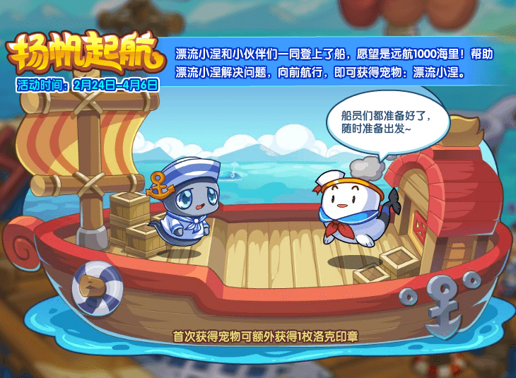 漂流小涅和小伙伴们一同登上了船,愿望是远航1000海里!帮助漂流小涅解决问题,向前航行,即可获得宠物:漂流小涅。