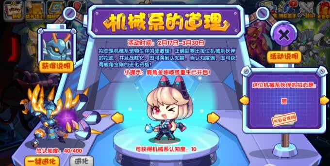 活动每天有四只机械系的宠物登场,需要从宠物中选择与右侧中的拟态关键词对应的形态,例如:小小喵宝儿——猫。
