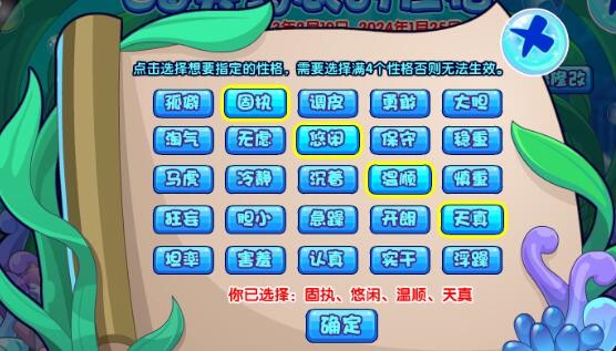 从第5次修正性格开始,我们需要先在25种性格中指定4种作为随机性格范围才可进行修正性格,比如这里小贝随便点了4个性格(真的是随便点的,不具指导意义!各位小洛克不要学小贝!)点击【确定】就完成了指定。指定范围的修改没有次数限制,注意需要选择满4个性格才可以哦!