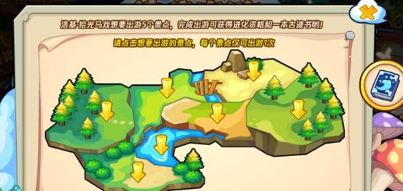 洛基·拾光马戏想要出游5个景点,我们可以在现有的7个景点中选择5个,每个景点出游需要消耗110洛克钻,完成出游即可获得洛基·拾光马戏的进化资格和一本古迹书,其中古迹书可以在《神水古迹》活动中使用获得海芙约忒,本活动最多可以获得4本古迹书。