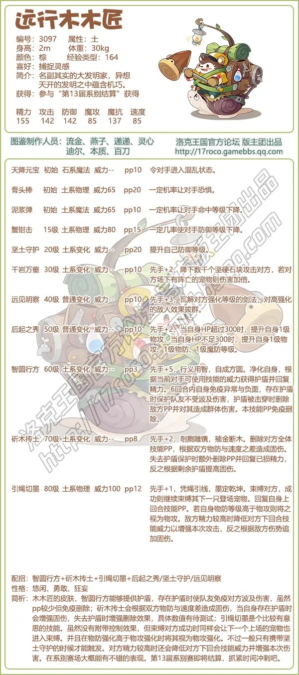 3、远行木木匠简析:木木匠的皮肤,智圆行方能够提供护盾,存在护盾时使队友免疫对方波及伤害,虽然pp较少但免疫删除;斫木抟土会根据双方物防与速度差造成固伤,当自身存在护盾时会增强固伤,失去护盾时增强删除效果,具体数值有待测试;引绳切墨是个比较有意思的技能。
