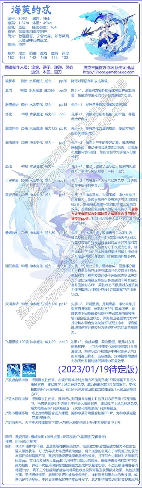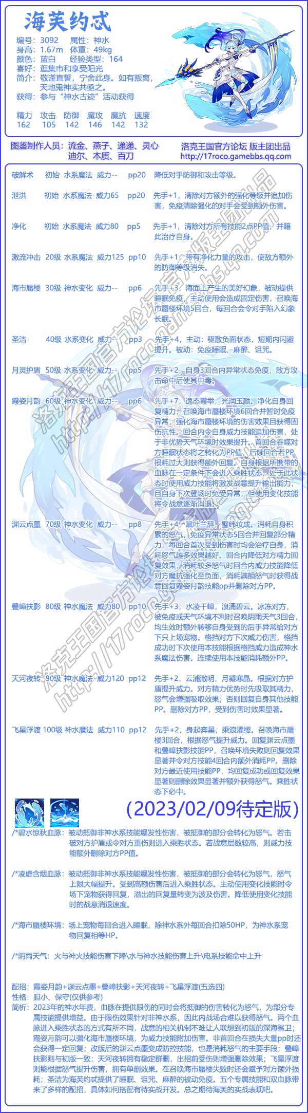 洛克王国游戏中海芙约忒是2023年的神水年费宠物,物攻种族从99到105,总和从823到829,技能的话,已经确定了5个专属了和双血脉。下面手游网小编就给大家带来了《洛克王国》海芙约忒技能表图鉴,技能表种族值可以让大家快速了解这个宠物各项信息,感兴趣的速来围观吧!