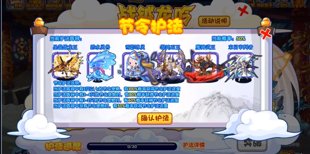 2.每种护法对应的护法阵容要求不同,节气护法时参与护法的节气宠物越多,则获得概率越大。具体阵容要求可以点击按钮进行查看;
