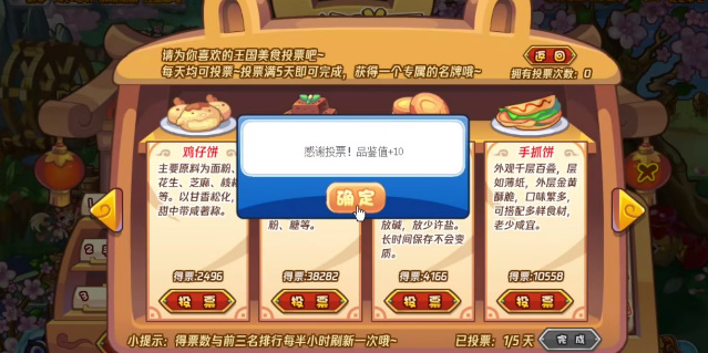 1.每日三票,可以给喜爱的糕点投上一票,目前人气最高的是可丽希亚公主喜爱的“红豆糕”(可随意投票哦);