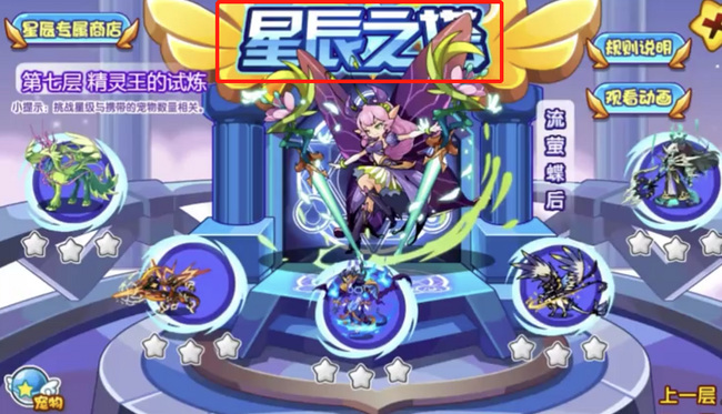1、进入星辰之塔挑战,然后用海拉比宠物即可,先使用海皇之佑技能可以海皇召唤深海水泡庇佑获得强力护盾,并且立即净化自身且暂时免疫异常和负面强化5回合,其次还可以并召唤一阵雷暴雨,使场上四回合内变为阴雨天气,更加给海拉比宠物有利然后慢慢消耗对方血量即可。