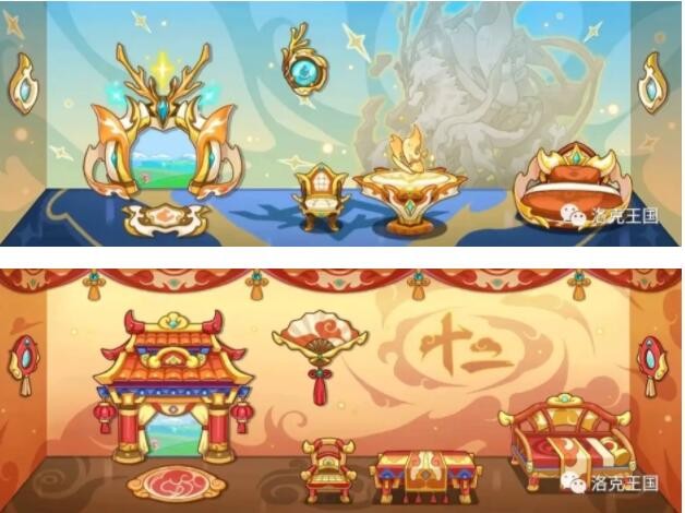 本次周年庆我们准备了两套主题家具,首先展出的是我们的云举瑶鹿主题家具!设计灵感均来源于我们奉神宠物,置身其中仿佛都能感受到灵气!另一套自然就是我们的国风主题啦!整个家园都被祥云环绕,是不是在这里也会有好运buff呢?(众:非酋小贝快醒醒!)
