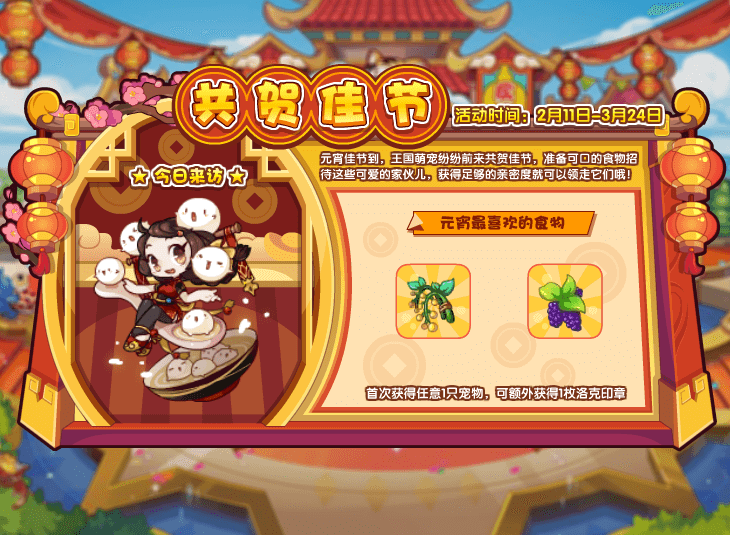 元宵佳节到,王国萌宠纷纷前来共贺佳节,准备可口的食物招待这些可爱的家伙儿,获得足够的亲密度就可以领走它们哦!