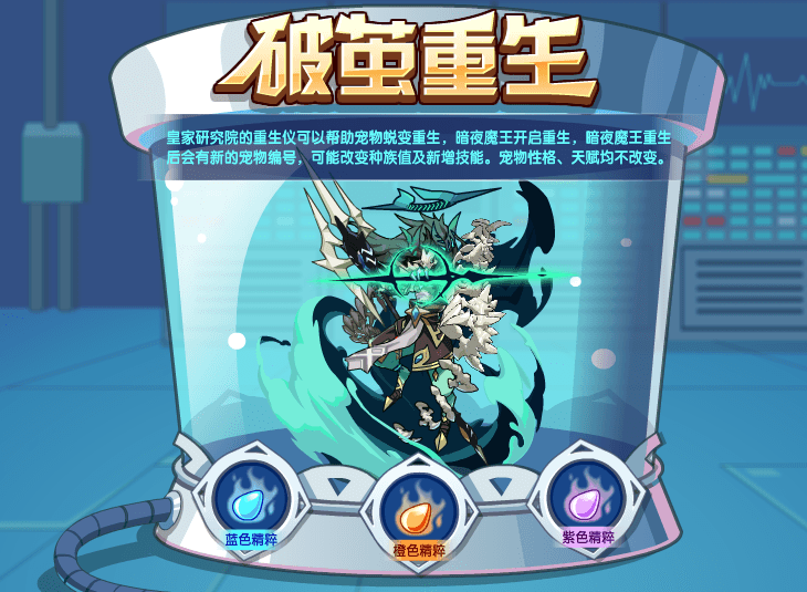 皇家研究院的重生仪可以帮助宠物蜕变重生,暗夜魔王开启重生,暗夜魔王重生后会有新的宠物编号,可能改变种族值及新增技能。宠物性格、天赋均不改变。