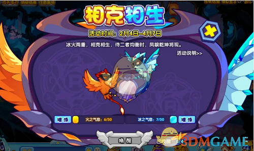3、活动攻略:干镜双凤回归啦!增添冰火两种气息各自到达50点时即可唤醒雏凤。增添冰火气息有三种方法:
