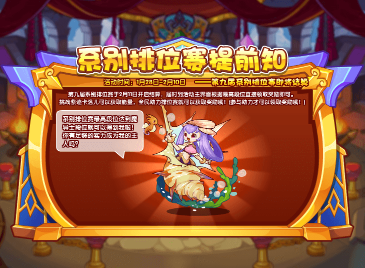 第九届系别排位赛于2月11日开启结算,届时到活动主界面根据最高段位直接领取奖励即可。挑战紫迹卡洛儿可以获取能量,全民助力排位赛就可以获取奖励哦!