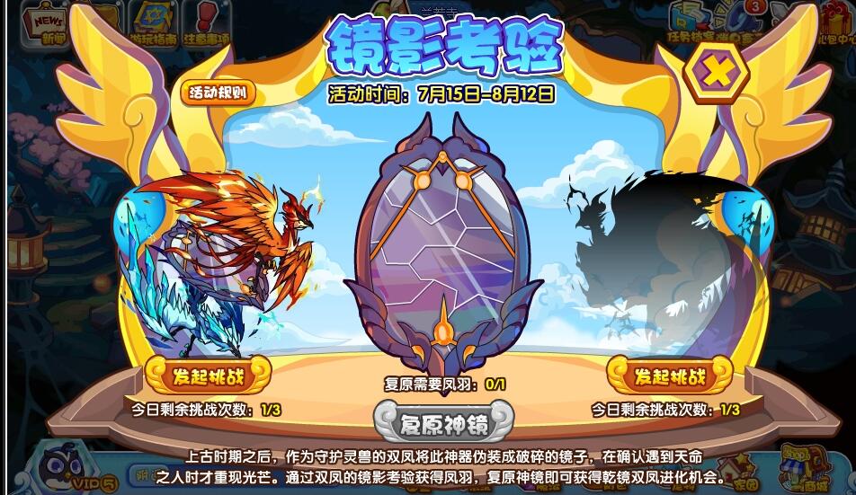 上古时期之后,作为守护使的双凤将此神器伪装成破碎的镜子,在确认遇到天命之人时才重现光芒。通过双凤的镜影考验获得凤羽,复原神镜即可获得乾镜双凤进化机会。