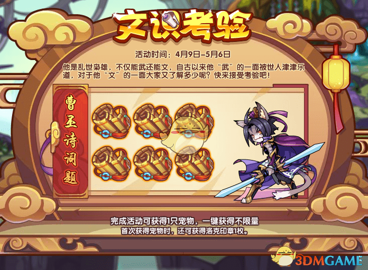参加并完成【文识考验】活动即可获得宠物:曹丕子桓。