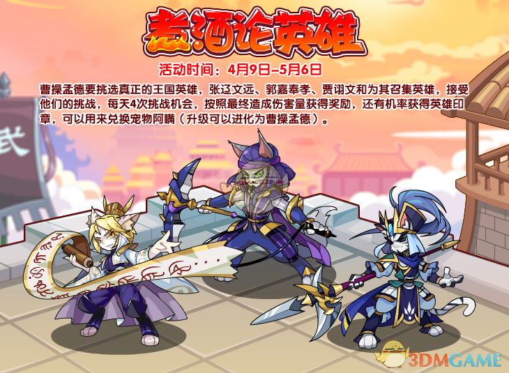 曹操孟德要挑选真正的王国英雄,张辽文远、郭嘉奉孝、贾诩文和为其召集英雄,接受他们的挑战,每天4次挑战机会,按照最终造成伤害量获得奖励,还有机率获得英雄印章,可以用来兑换宠物阿瞒(升级可以进化为曹操孟德)。