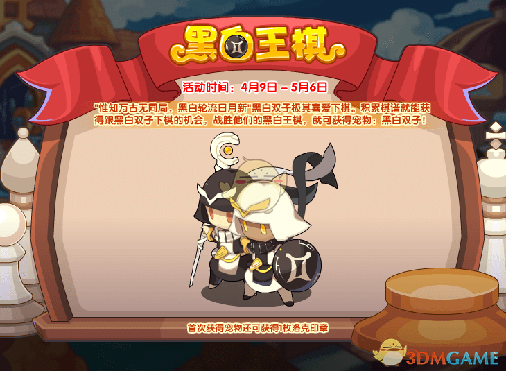 积累棋谱就能获得和黑白双子下棋的机会,击败他们的黑白王棋吧!完成活动就可获得宠物:黑白双子!