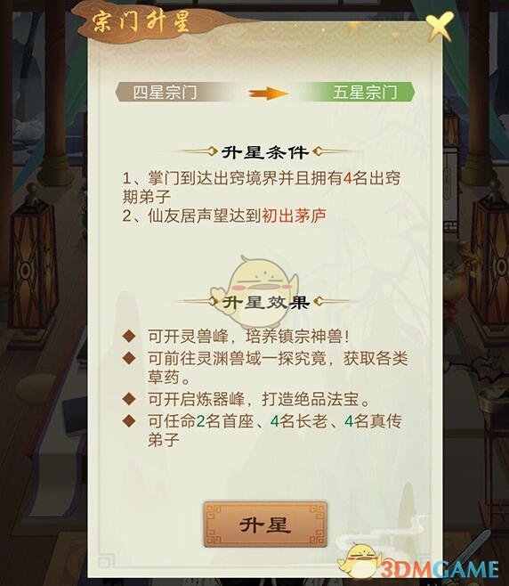 宗门的星级在游戏中还是非常重要的,在每个星级阶段所必须的条件都不一样,例如从四星到五星所必须的条件就是掌门到达出窍境界并且拥有4名出窍期弟子,而且仙友居声望达到初出茅庐。