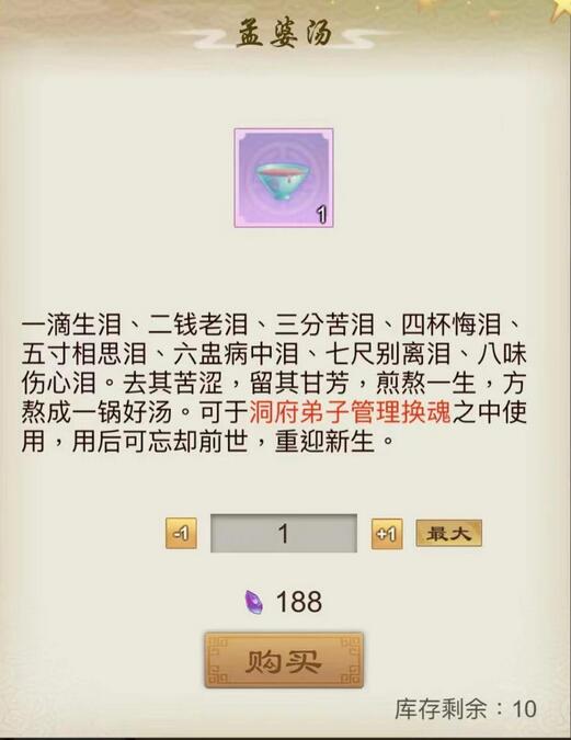 孟婆汤道具可以用于洞府弟子管理换魂之中使用,用后可以忘记前世,重新迎接新生。