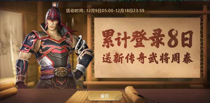 玩家在活动期间内每日登陆游戏即可领取元宝,战魂经验,兵印礼盒等奖励,累积登陆8日可领取传奇武将·周泰