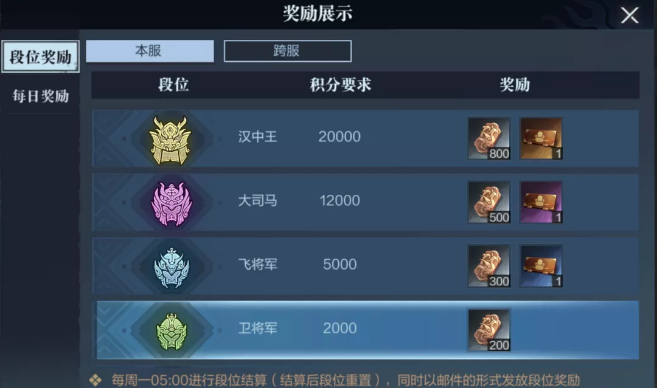 该玩法的奖励分为两种,分别是段位奖励与每日奖励,根据战场的不同,还可进一步分为本服奖励与跨服奖励。