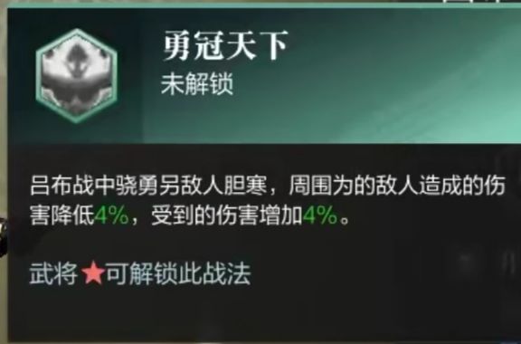 吕布战中骁勇另敌人胆寒,周围为的敌人造成的伤害降低4%,受到的伤害增加4%。