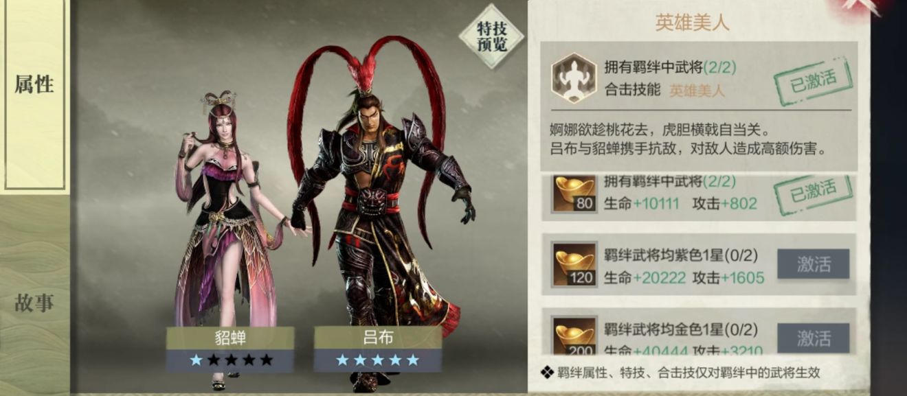 拥有羁绊中武将(2/2)合击技能英雄美人
