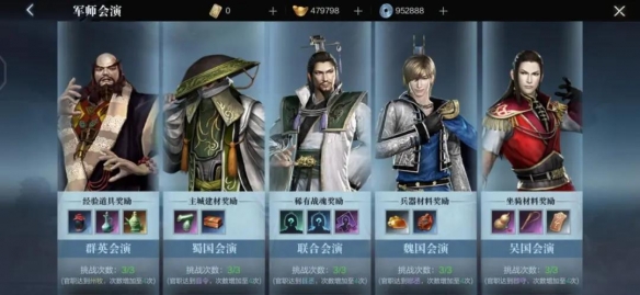 需要注意,不同难度的会演是需要主公达到一定等级后,获得军师的认可方能挑战的。并且各国的会演需要对应国家的武将方可出战挑战,譬如蜀国的会演只能由赵云等蜀国武将参加,吕布是无法被编入挑战队伍的。